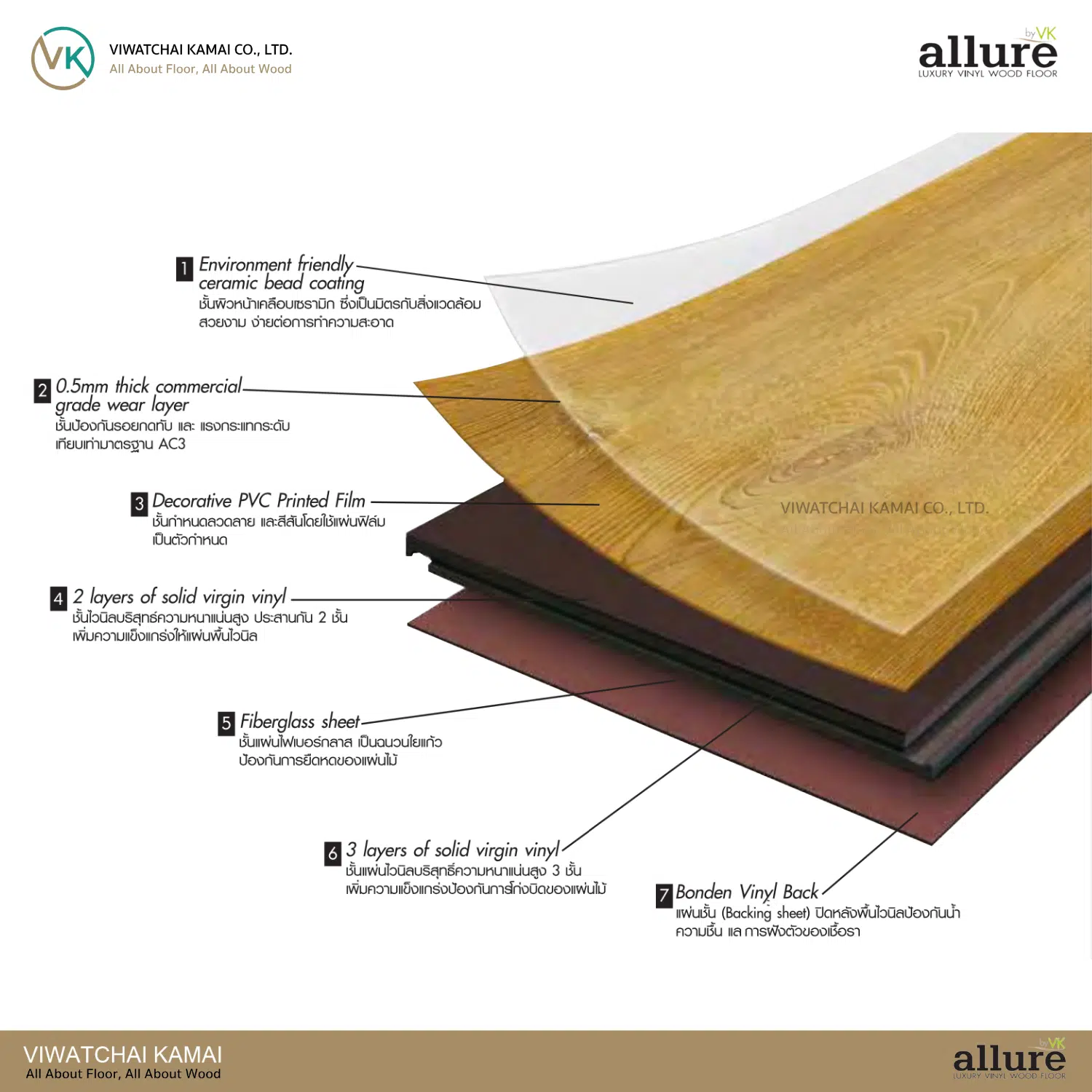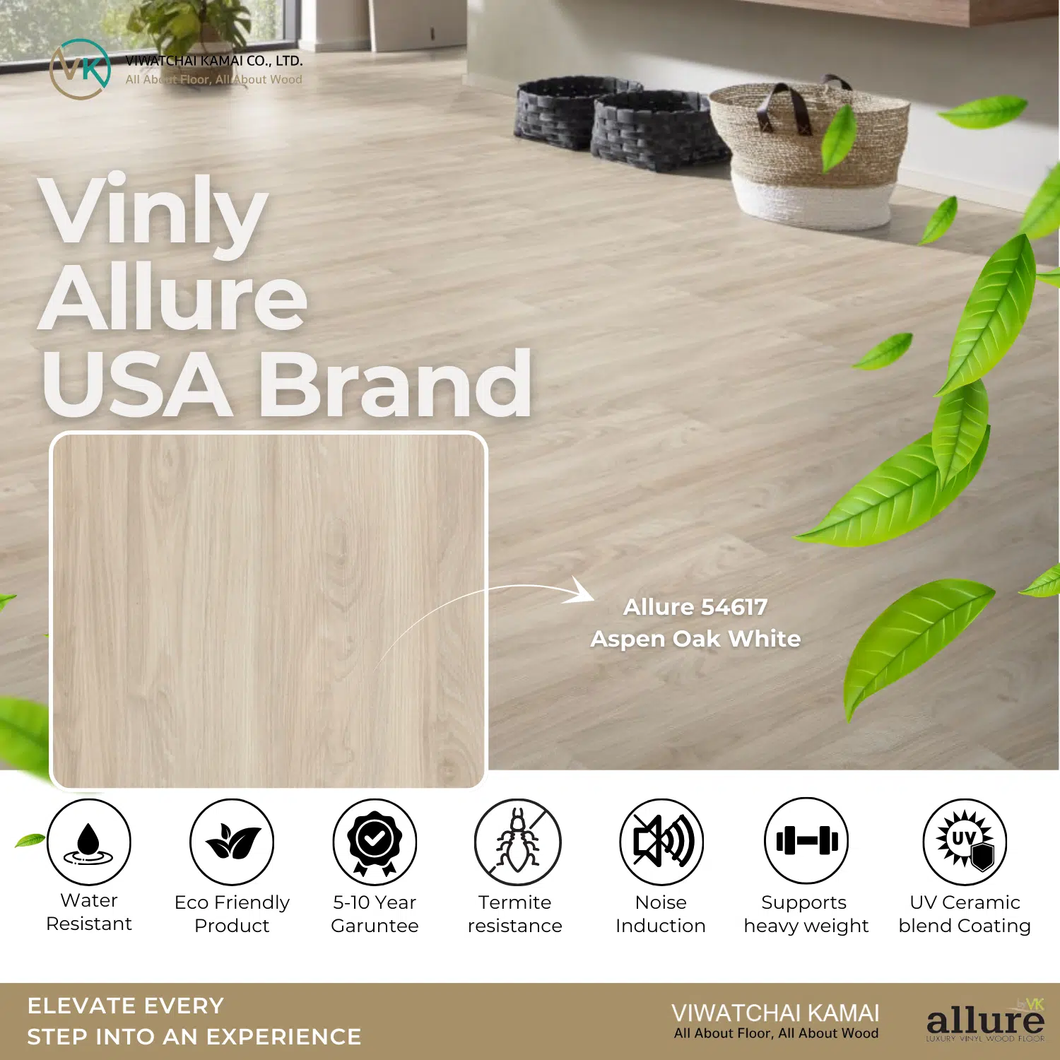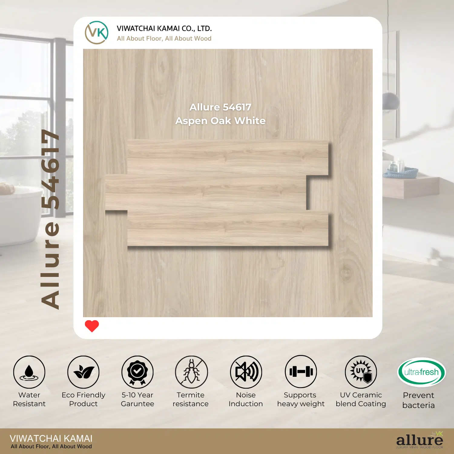 พื้นไวนิล Allure ผลิตจากไวนิลบริสุทธิ์ (Virgin Vinyl 100%) ทนรอยขีดข่วนด้วยชั้น Ceramic Bead ทนน้ำ ทนปลวก ปลอดภัยต่อสุขภาพ ปลอดสารพิษ พื้นผิวไม่ลื่น ติดตั้งง่ายด้วยระบบคลิกล็อก ดีไซน์เสมือนไม้จริง เหมาะกับบ้าน คอนโด ออฟฟิศ ฟิตเนส โรงแรม ฯลฯ