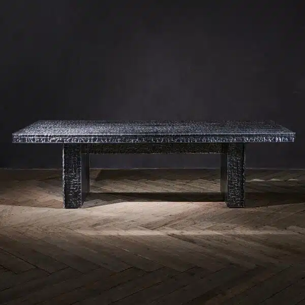 contrasts with the charred look of the rugged timber,